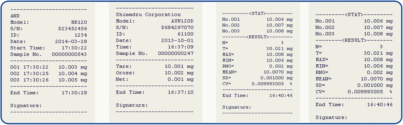 - Support List: SHIMADZU, SARTORIUS, METTLER, AND, ADAM, OHAUS,SHINKO…ect.- High-speed dot printing, printed pages are suitable for long-term preservation, ISO/GLP compliant Data Printout.- 128x64 OLED display.- Built in realtime clock.- Support weighing, statistical, sum, mean and formulation function.- Editable title and tail.- Sample name and batch number can be inputted and printed.- Data export: all data from balance can be exported to U-Disk in excel or txt file.- Periodic printing.- Barcode Scanner Support.