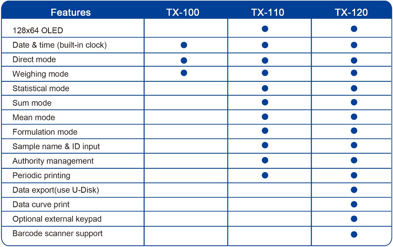 The TX-100/110/120 series balance printer, which has a streamlined appearance and an outstanding costeffective, completely meets the qualityrequirements of the chemical and pharmaceutical industry and GLP, GMP standard certification.From the most basic printing needs, to the wealth of applications, the TX-100/110/120 series balance printer provides users witha flexible choice.